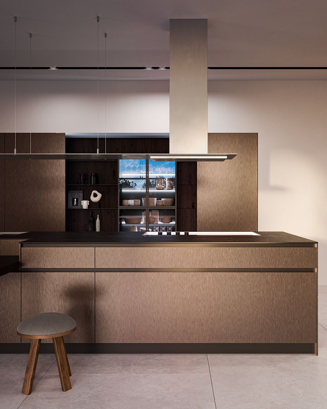 The door panel is sprayed with a metallic paint that creates a resistant finish. Doimo Cucine, for example, offers four options in pink gold, gold, zinc and nickel.