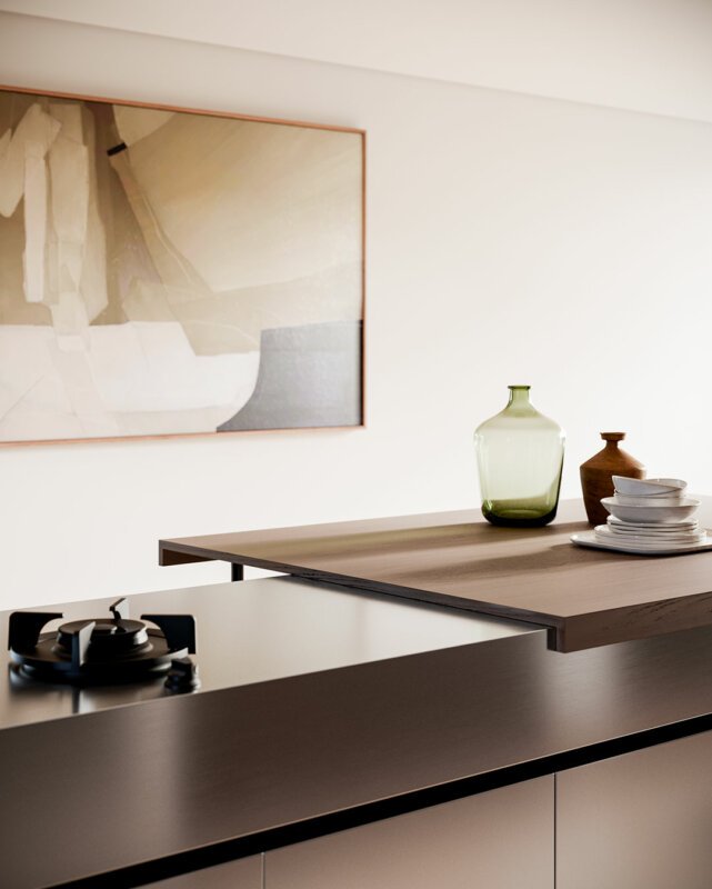 A table height counter is almost always a custom made element, set into or resting on top of lower base cabinets (60 cm) to ensure that the top is between 72 and 80 cm, an ideal dining room table height. This type of counter features a supporting leg, in glass, metal or the same material as the top itself. They are handy for: