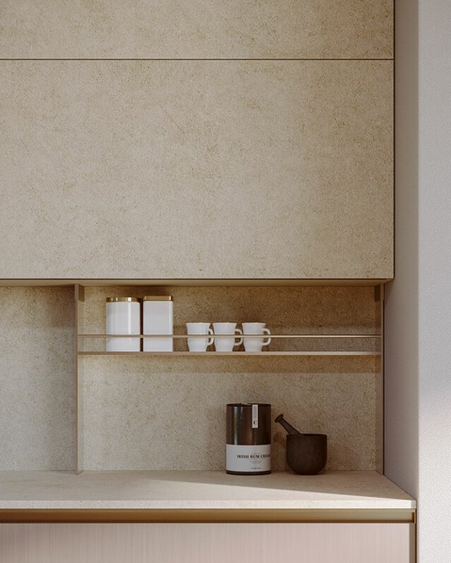 To ensure comfortable movements, the recommended distance between the upper cabinet and countertop is an average of 55/60 cm. This dimension is both necessary and legally mandated, in order to guarantee the proper exhausting of vapours, when the upper cabinets feature an integrated exhaust hood above the cooktop.
